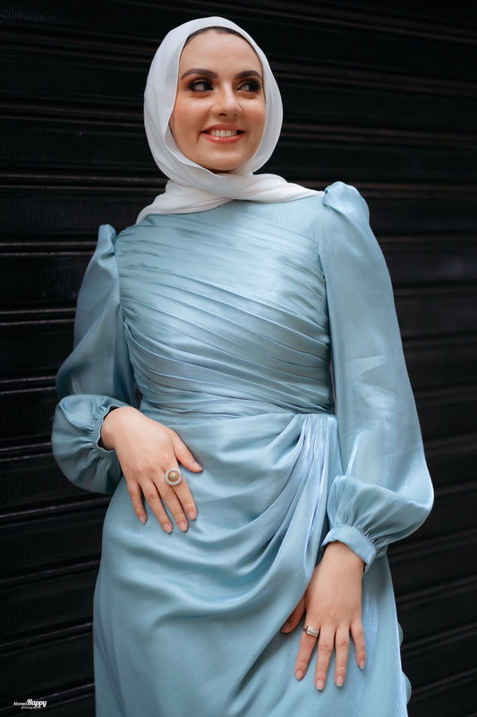 Baby-blue Draped Top Soiree Dress with Shoulder Extension