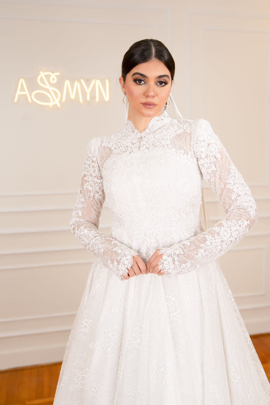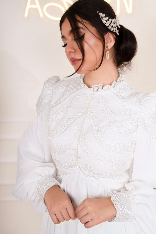 Off-white Princess Bridal Dress with Embroidered Sleeves