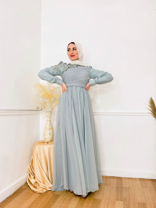 Baby-blue Embroidered Satin Soiree Dress with Extension
