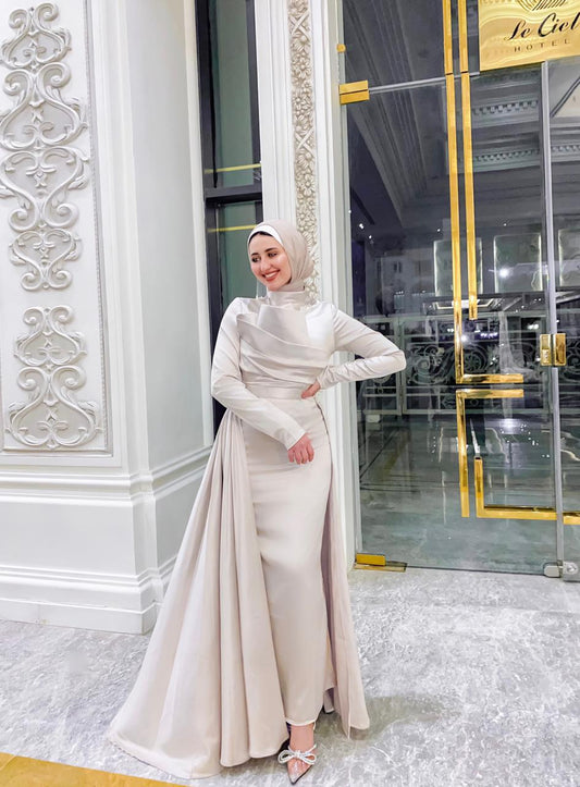 Champagne Satin 2-pieces Dress Set with One-side Shoulder Flowers