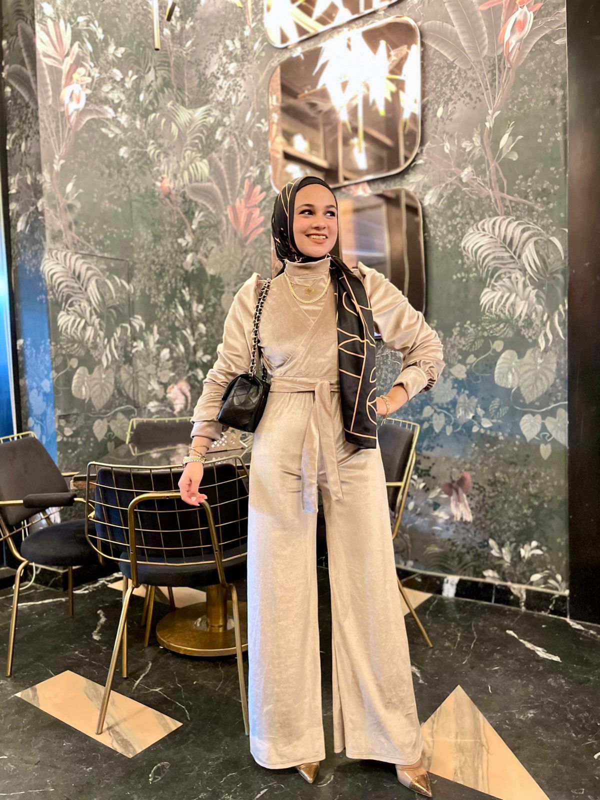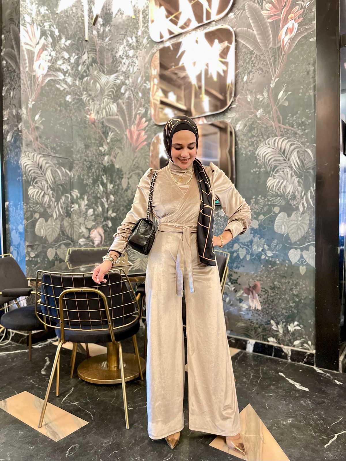 Beige Velvet Classic Cross-Wrap Jumpsuit