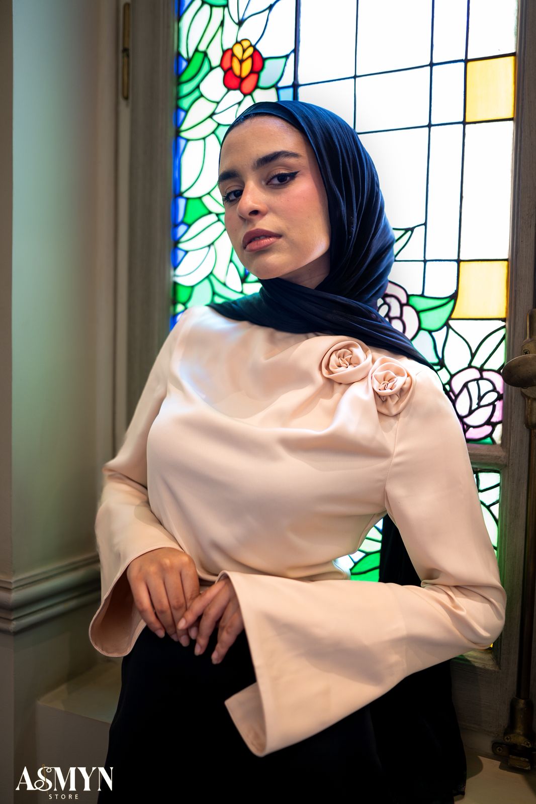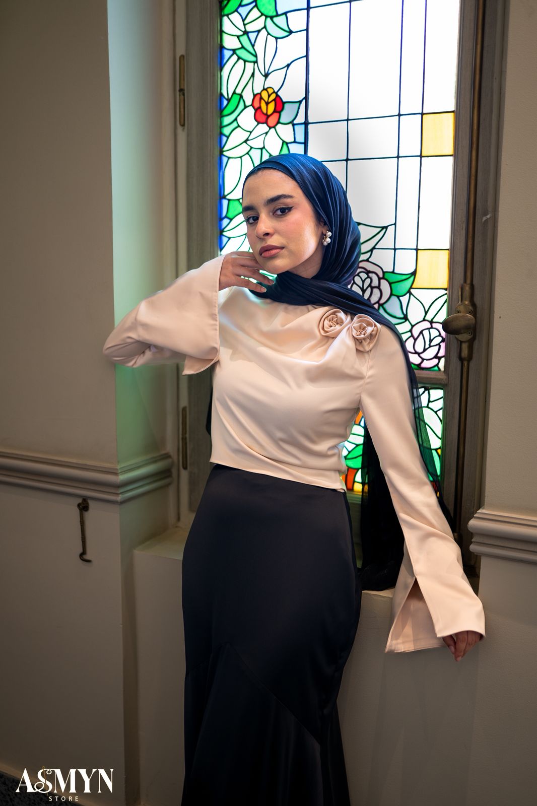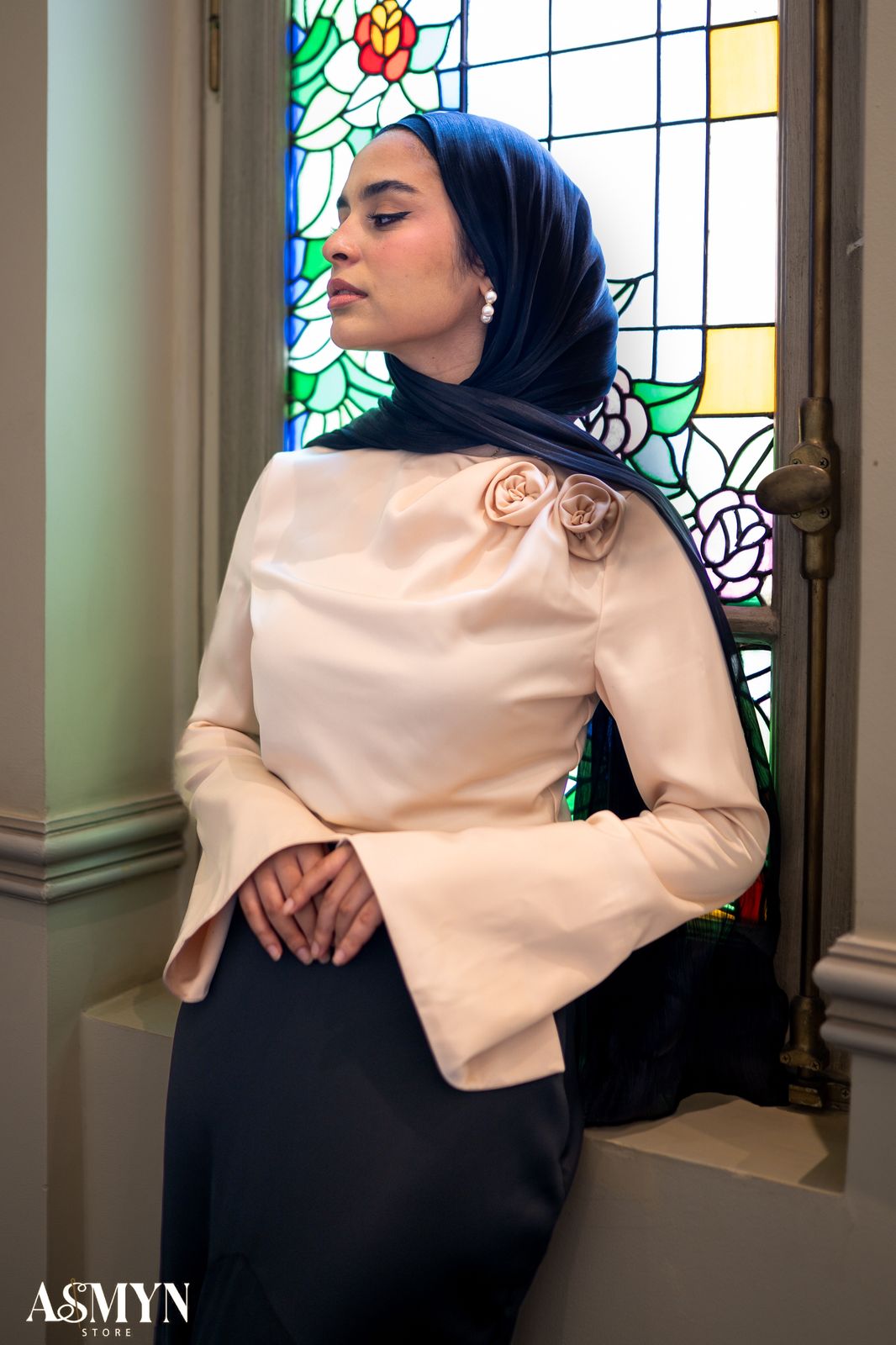 Champagne Satin Blouse with One-side Shoulder Flowers