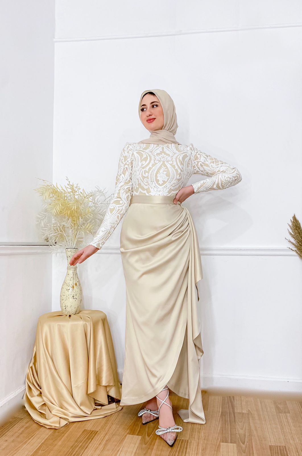 - Material: تل مطرز مع ستان مارلين إيطالي .