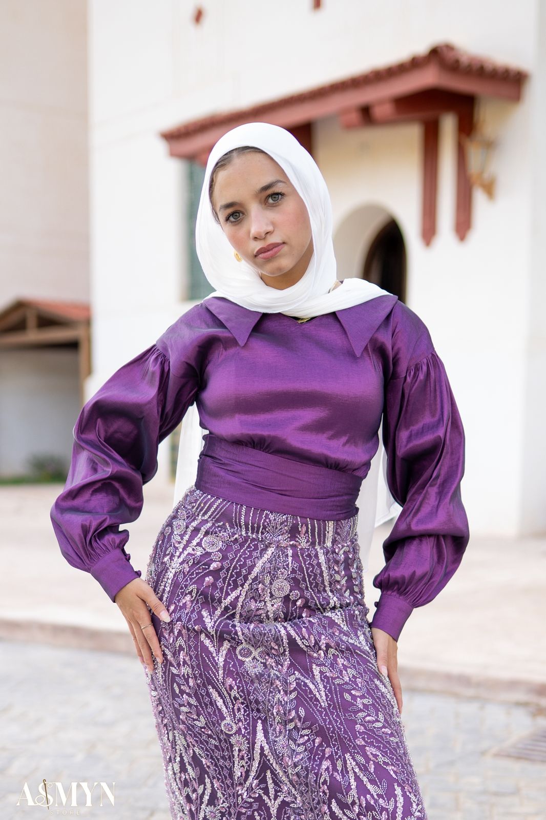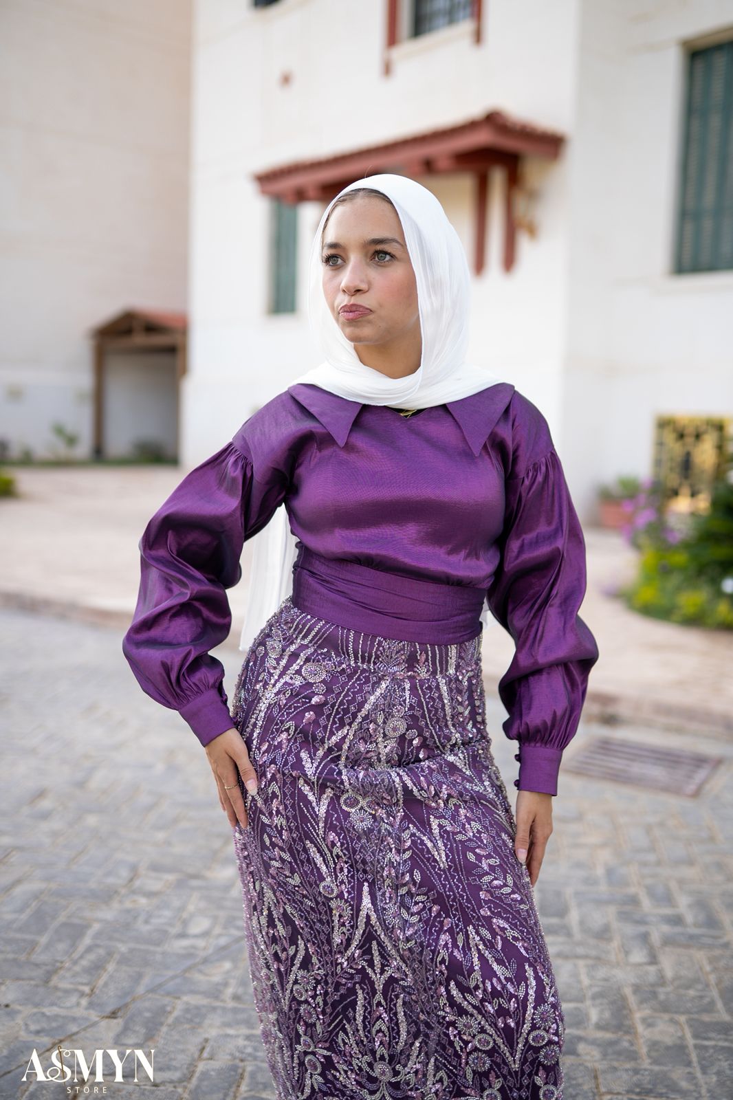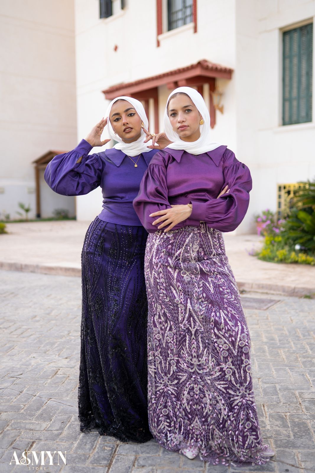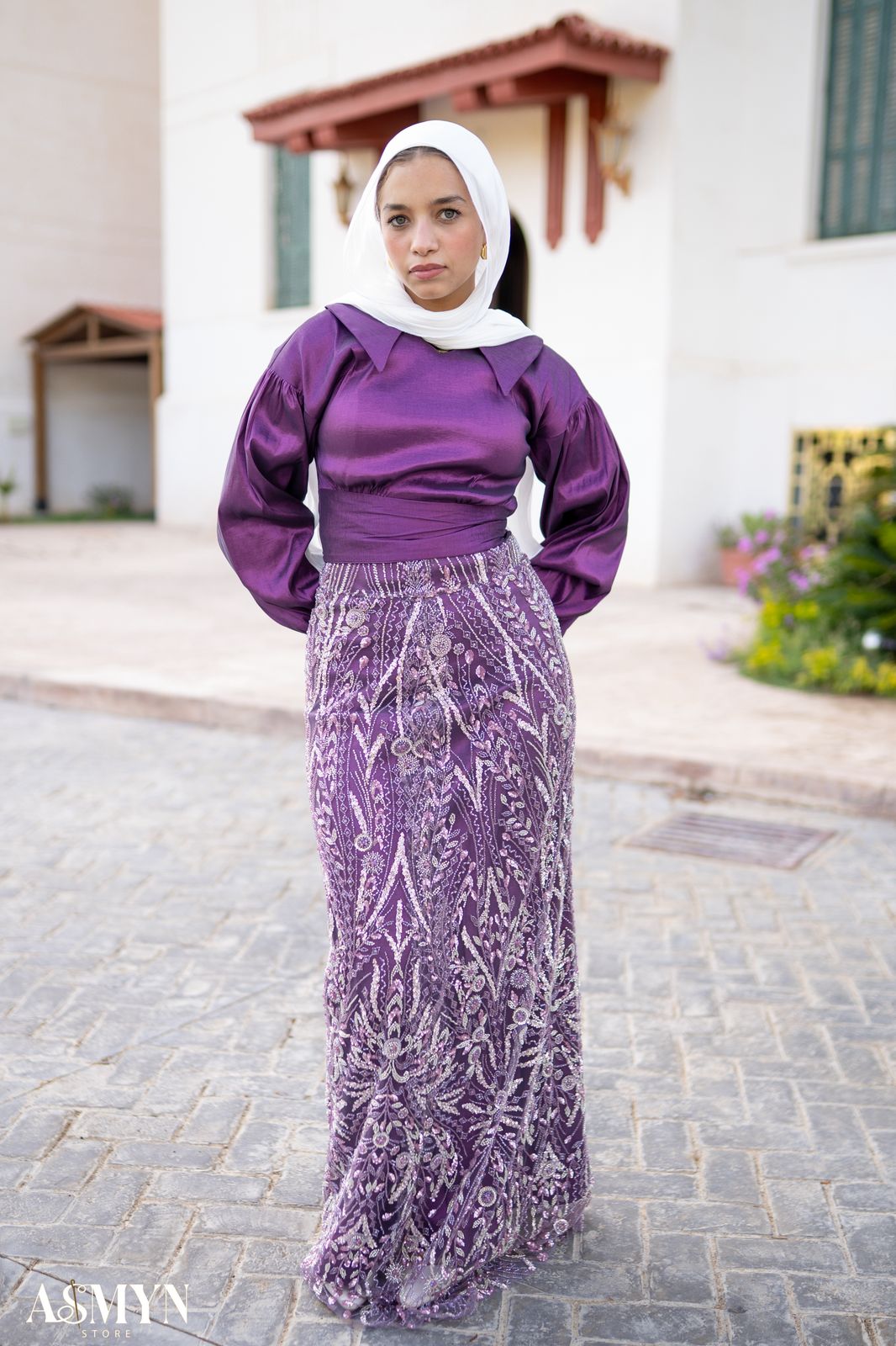 Dark Purple Soirée 2-Pieces Dress Set with Embroidered Skirt