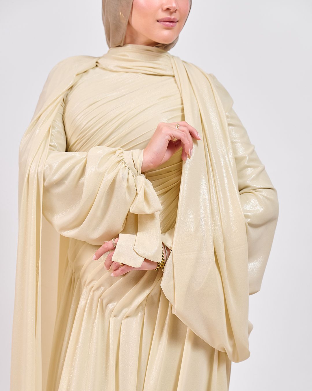 Crafted from luminous crystal lycra and fully lined with crepe, this dress features an internal corset for a structured, flattering fit. Soft draping enhances the silhouette, creating an elegant, fluid look with a subtle sheen.