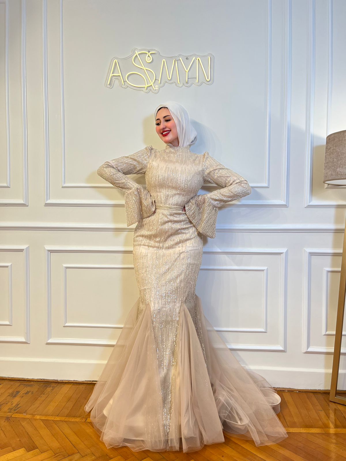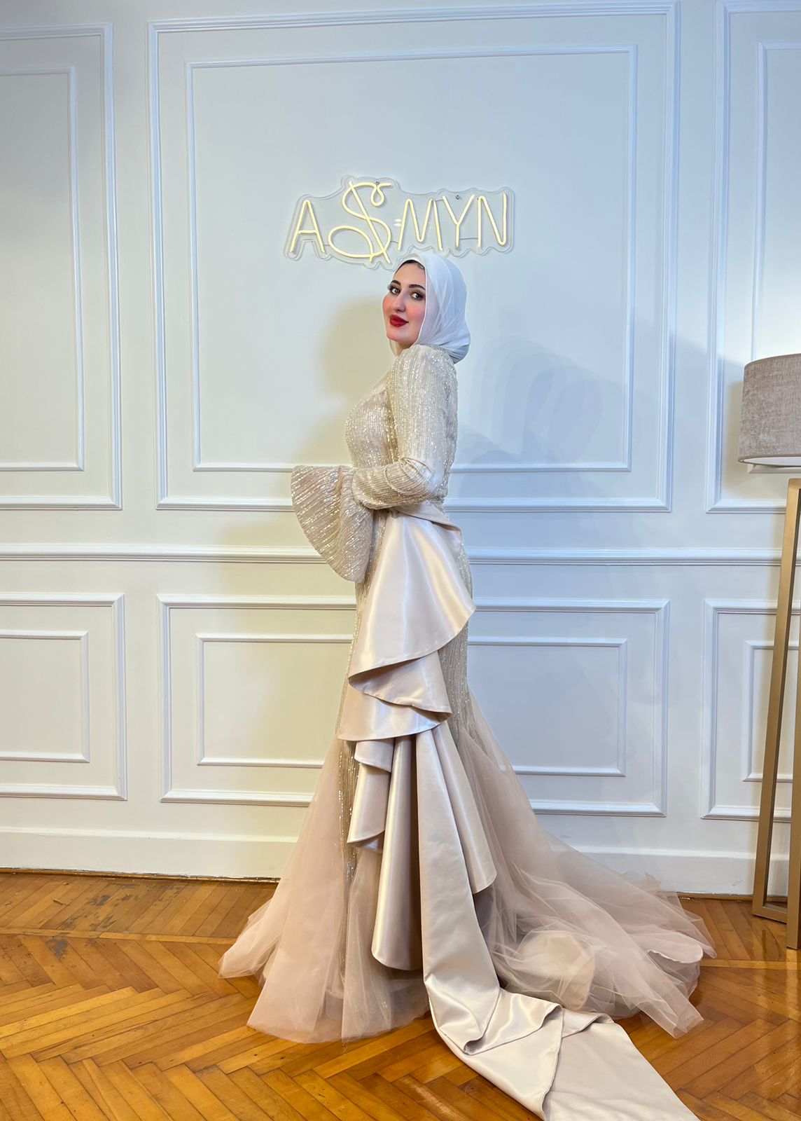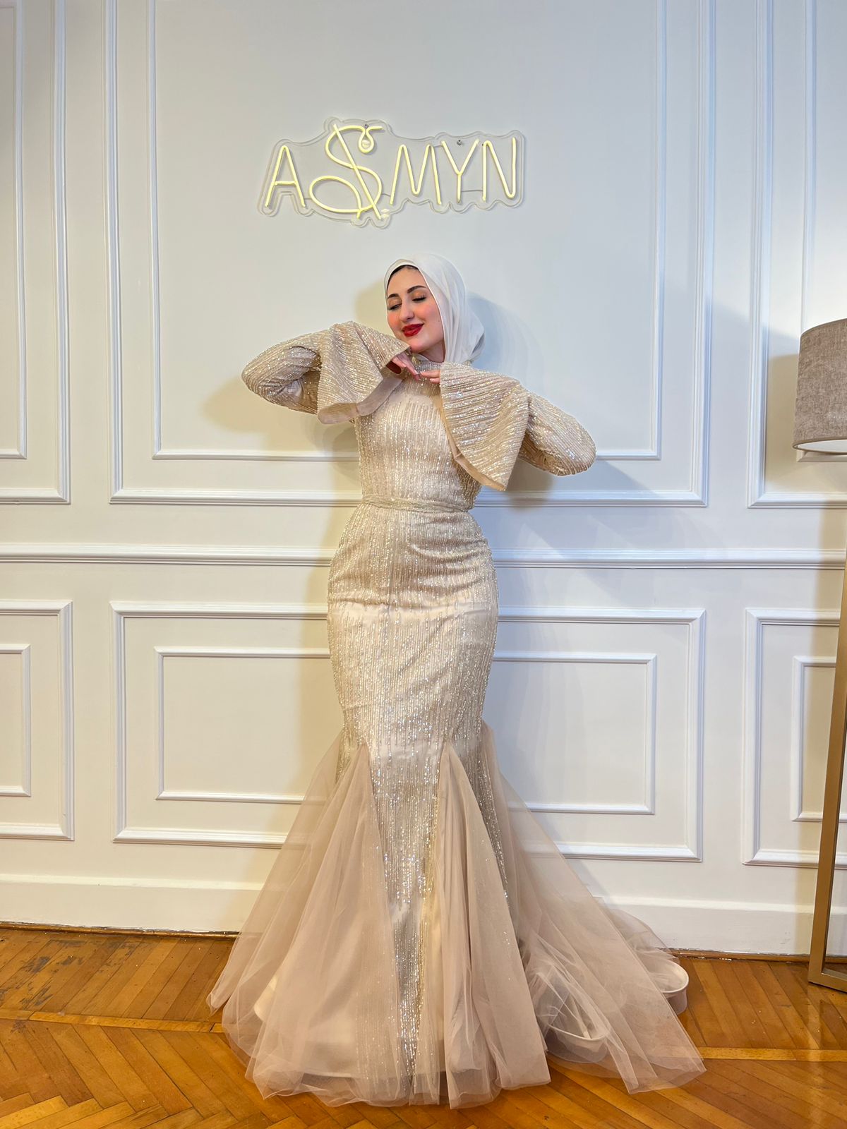 - Material: تل مطرز هاند ميد مع تل ايطالي مبطن بالكامل