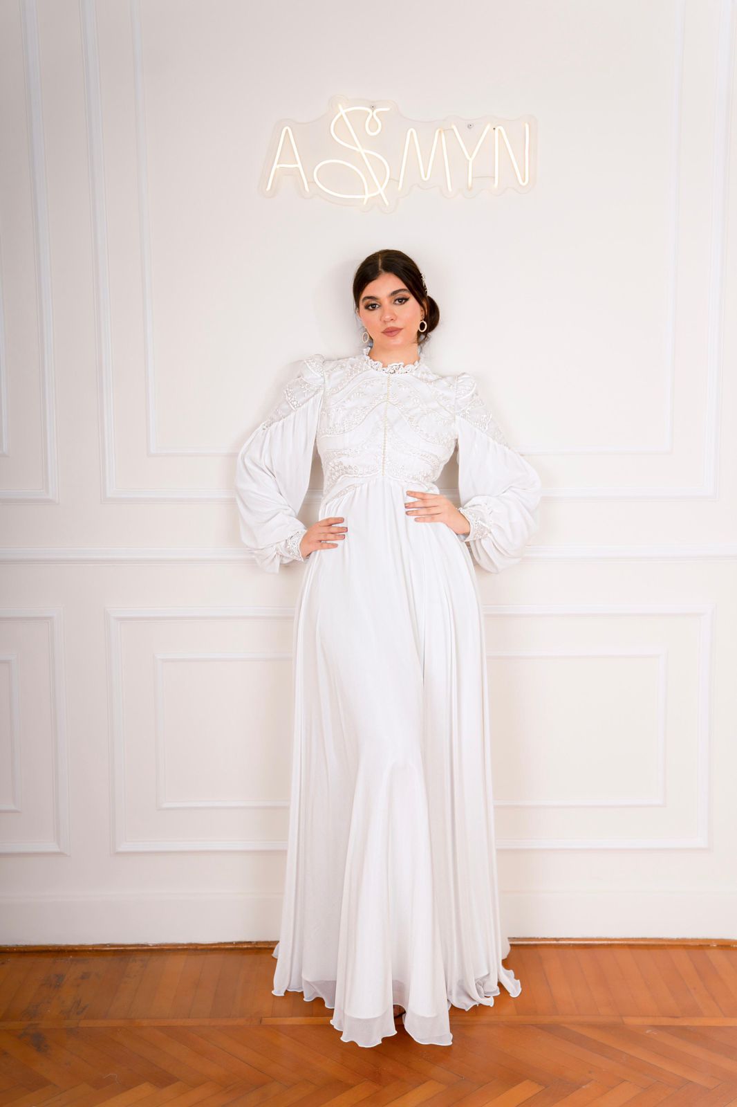 - Material: شيفون مع تل مطرز مبطن بالكامل
