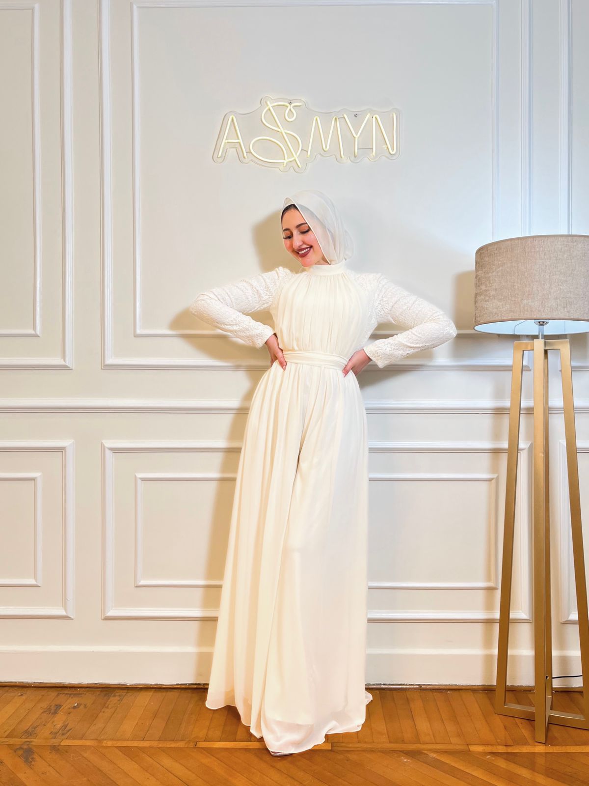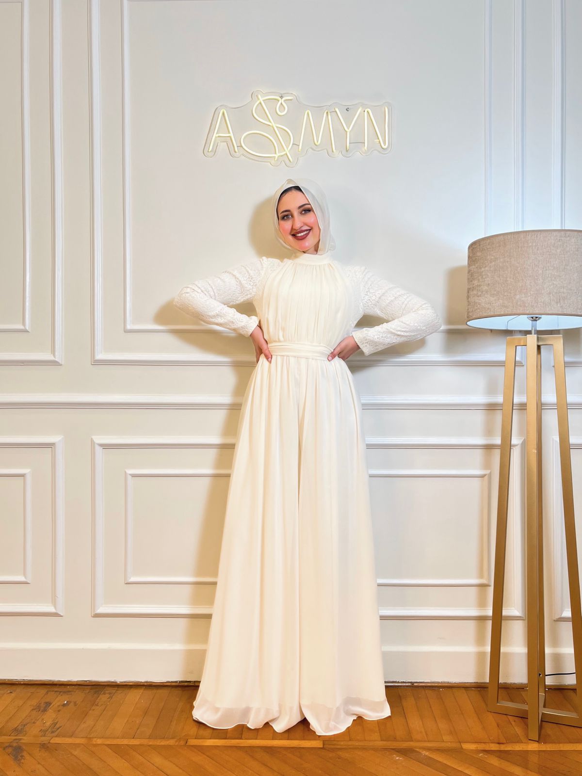 Off-white Draped Chiffon Soiree Jumpsuit with Embroidered Sleeves
