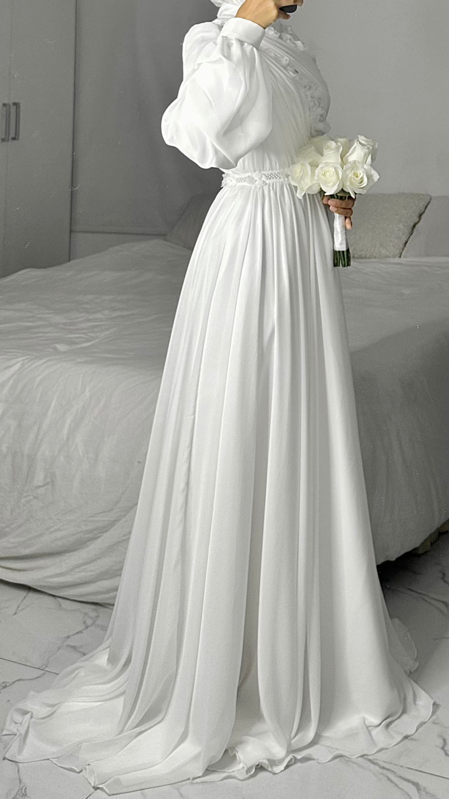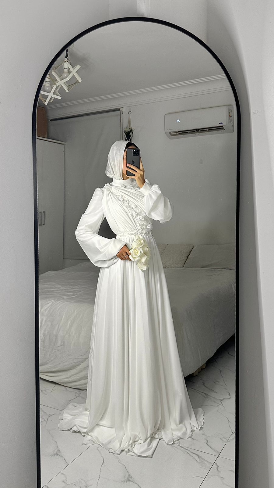 - Material: شيفون ايطالي بيو مبطن بالكامل ستان مع ورد من الحرير واللولي