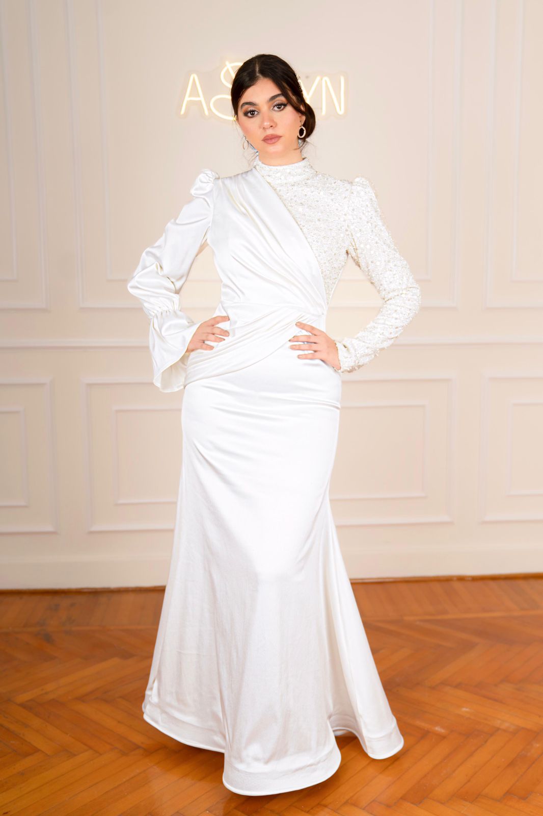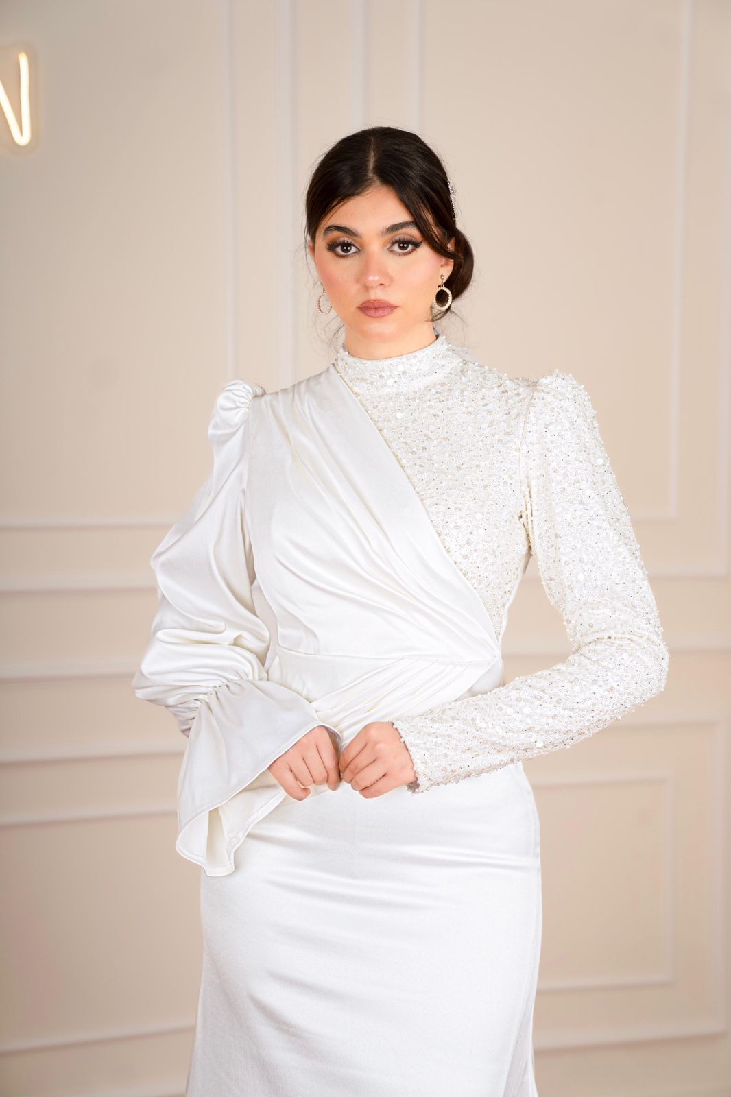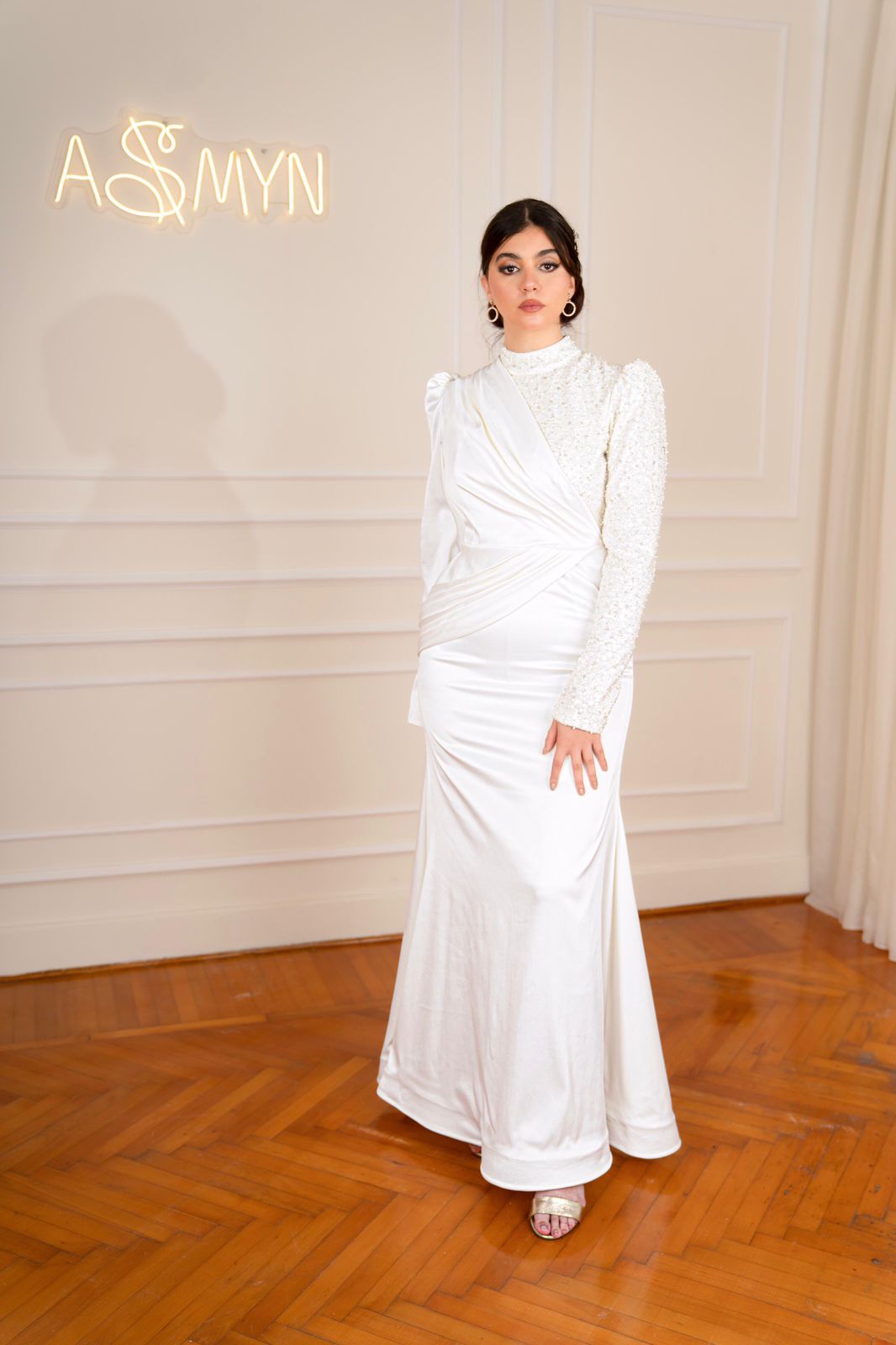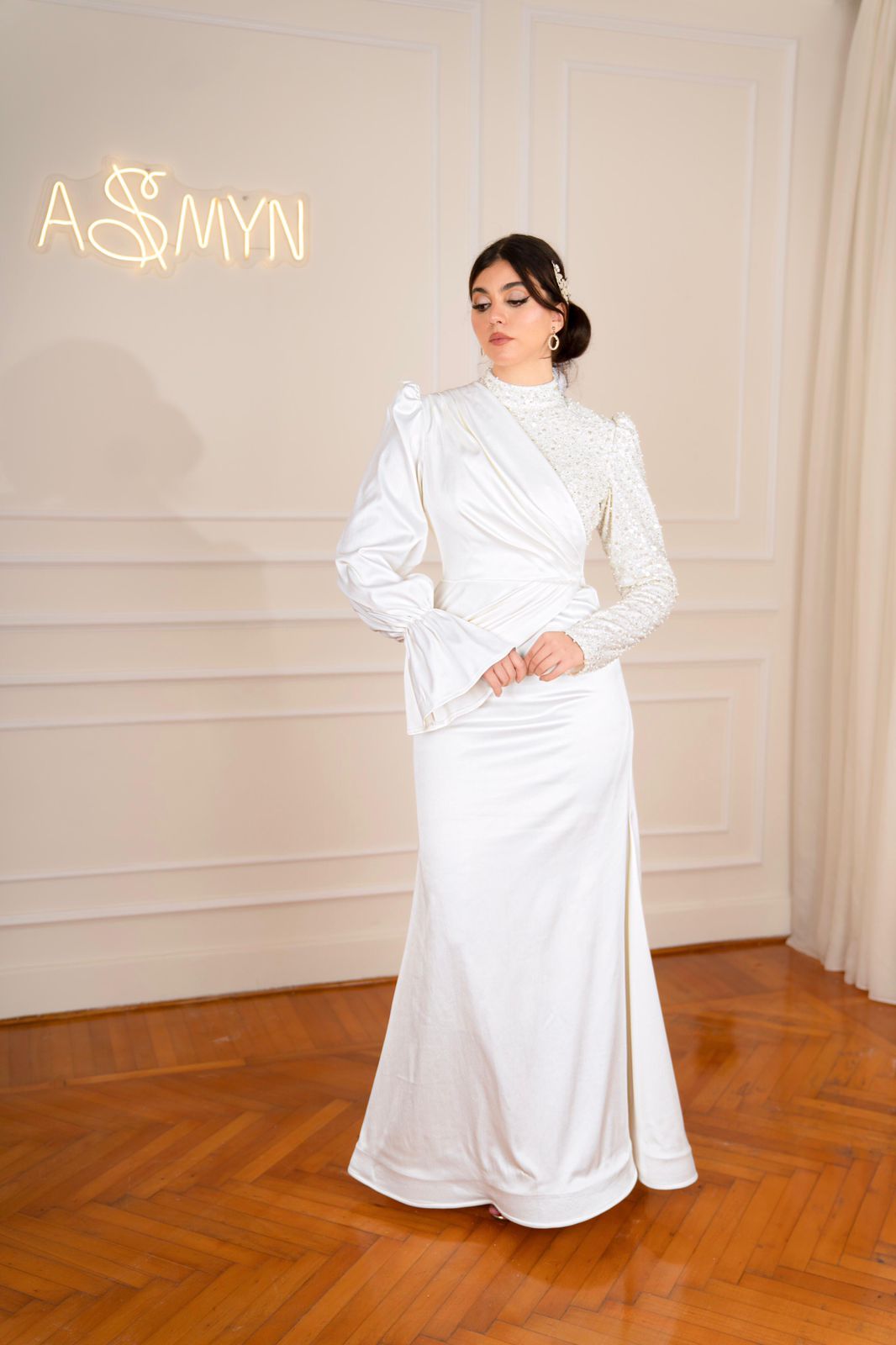 - Material: ستان مارلين إيطالي مع تل مطرز هاند ميد مبطن بالكامل.