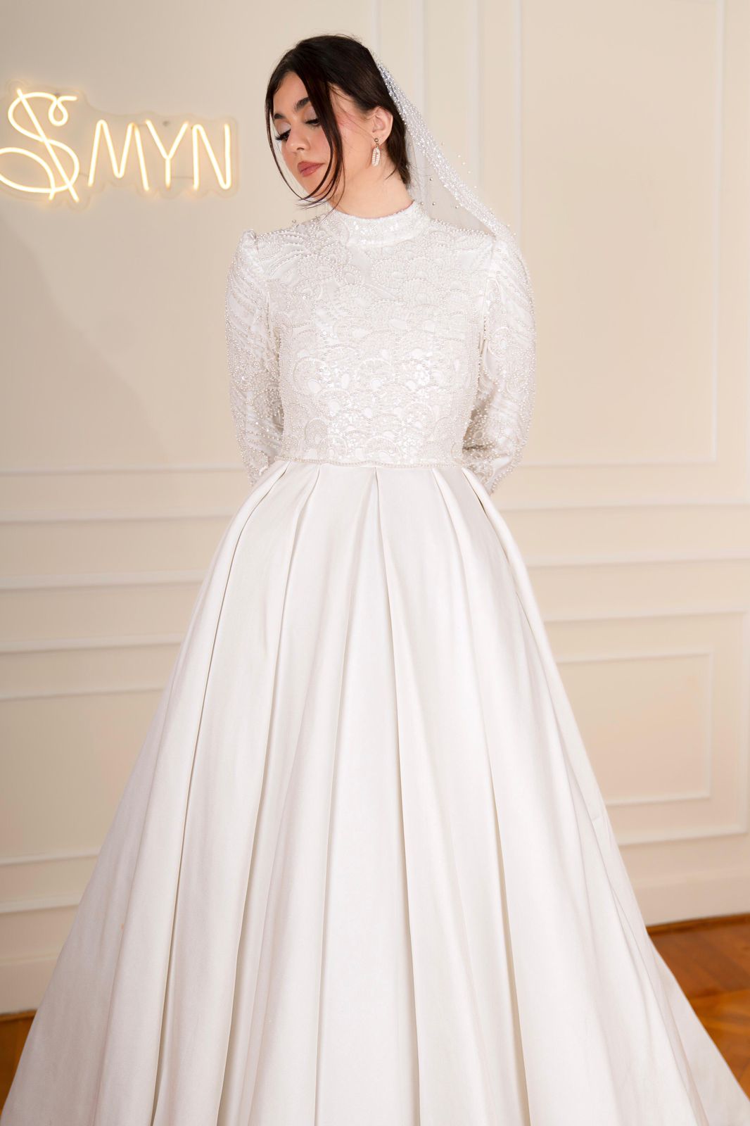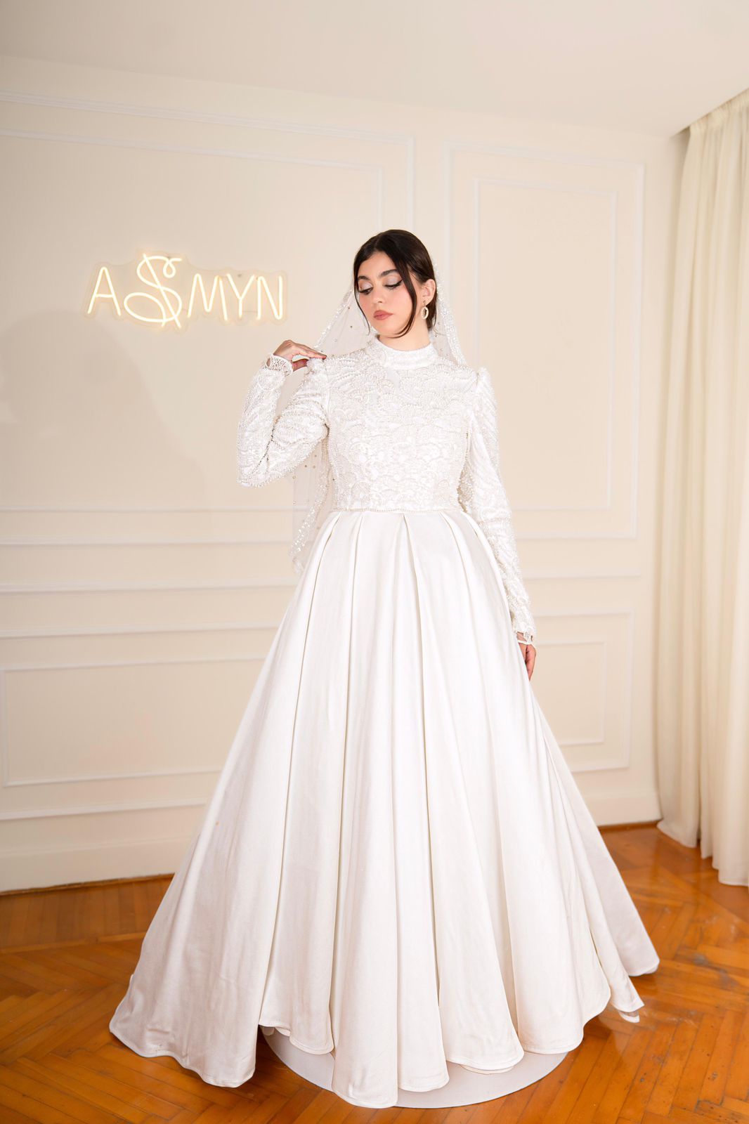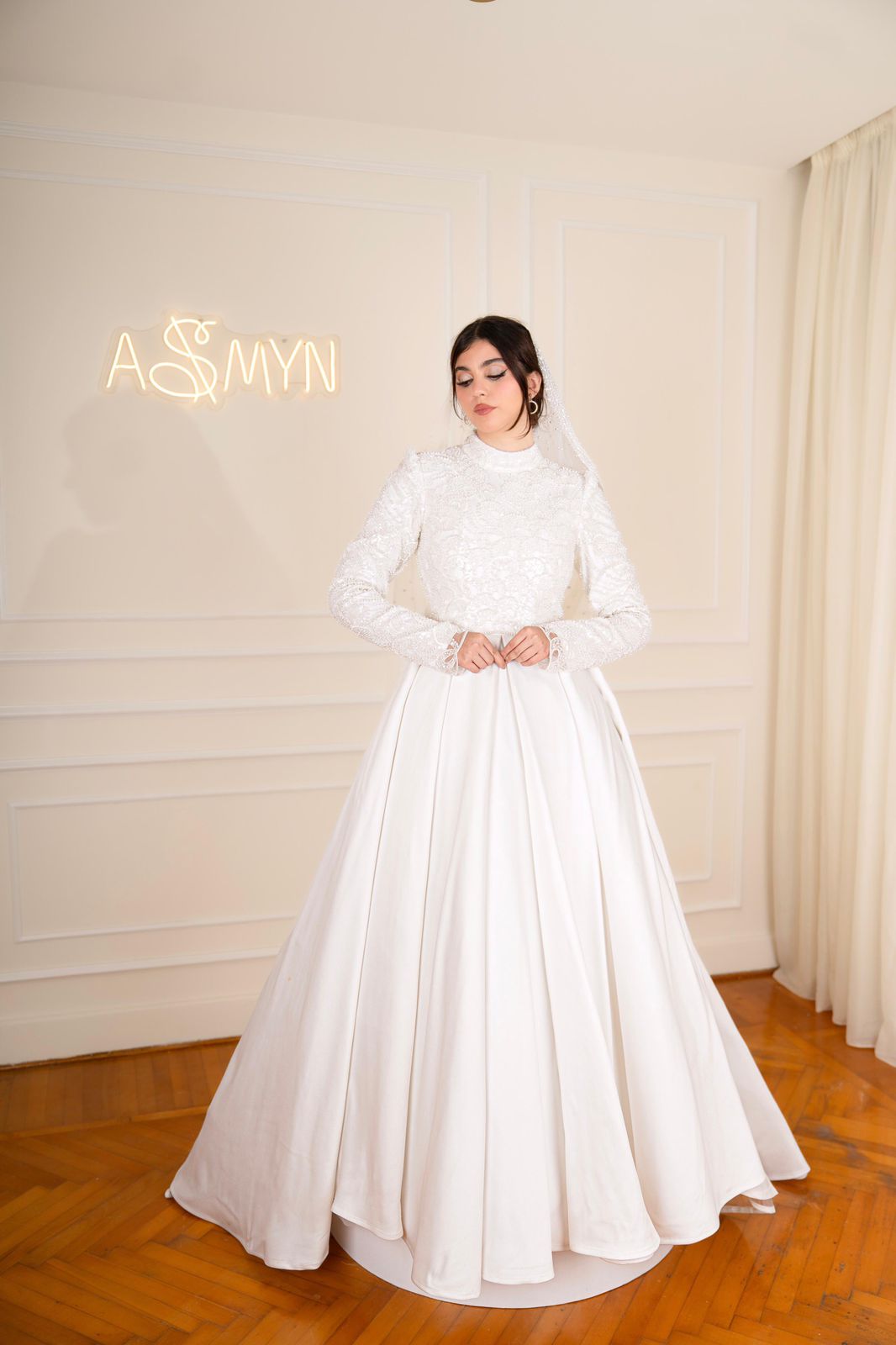 - Material: ستان مارلين ايطالي مع تل مطرز هاند ميد مبطن بالكامل