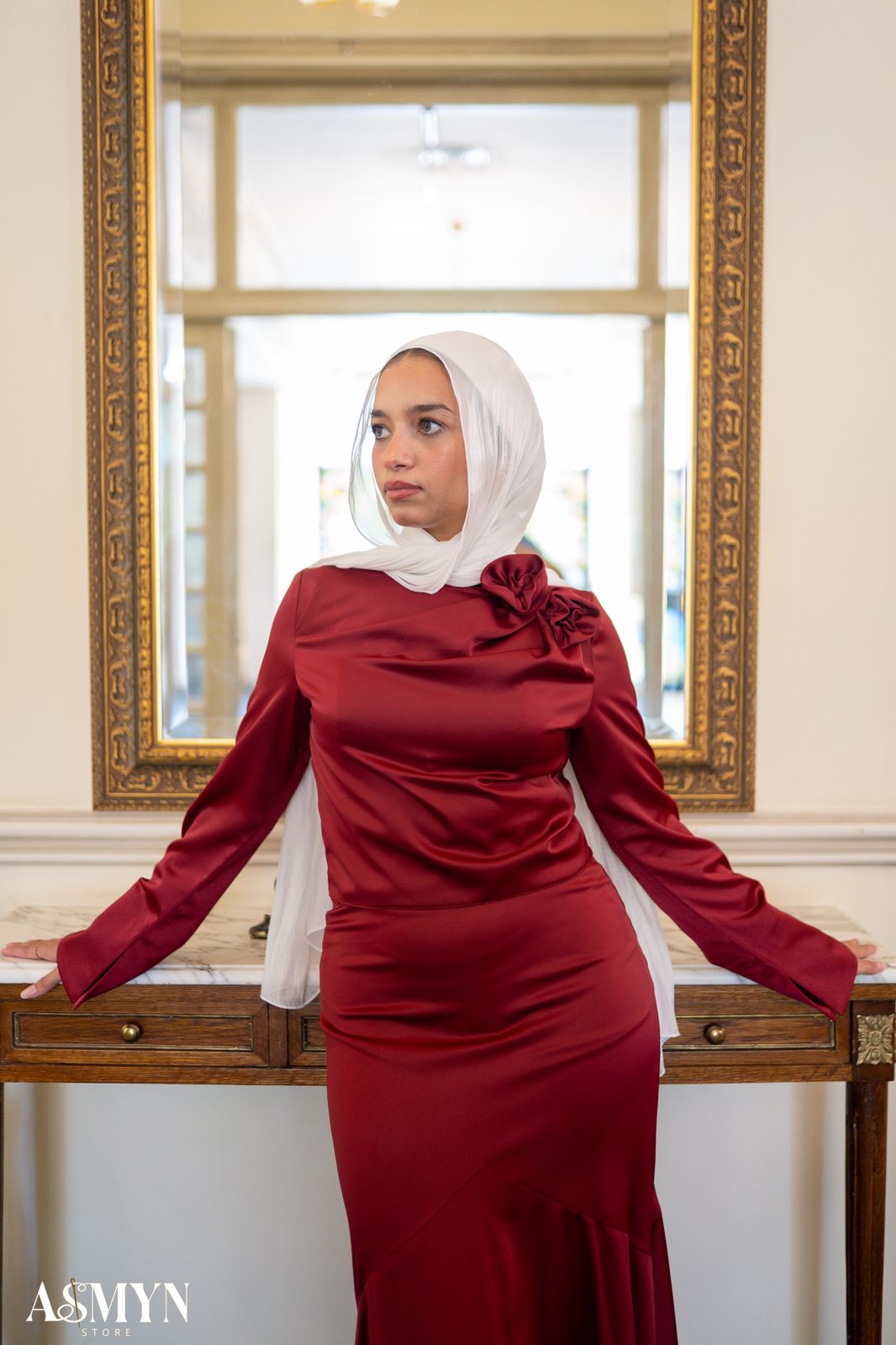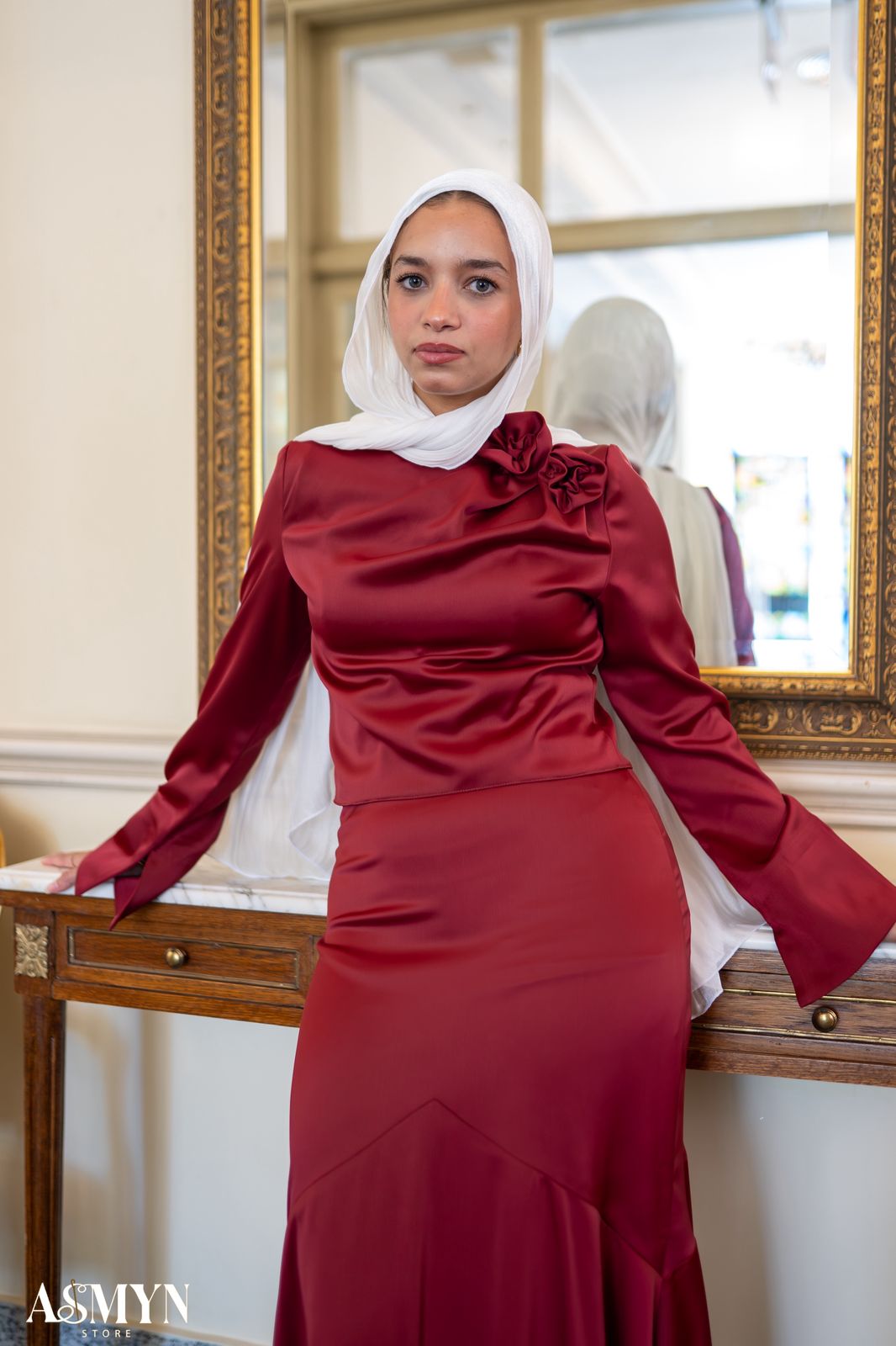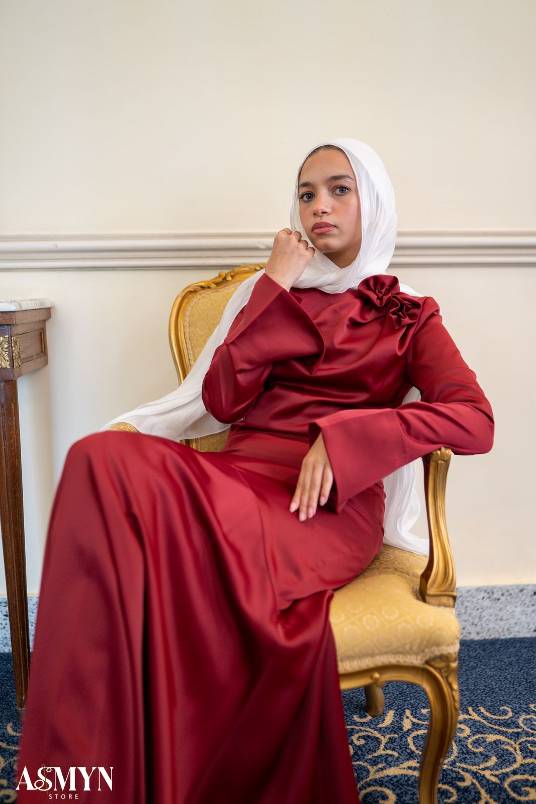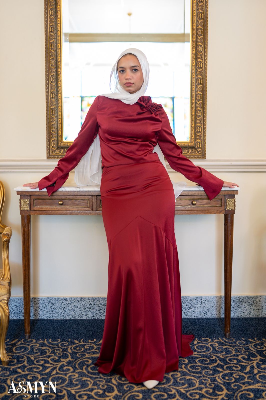 Red Satin 2-pieces Dress Set with One-side Shoulder Flowers