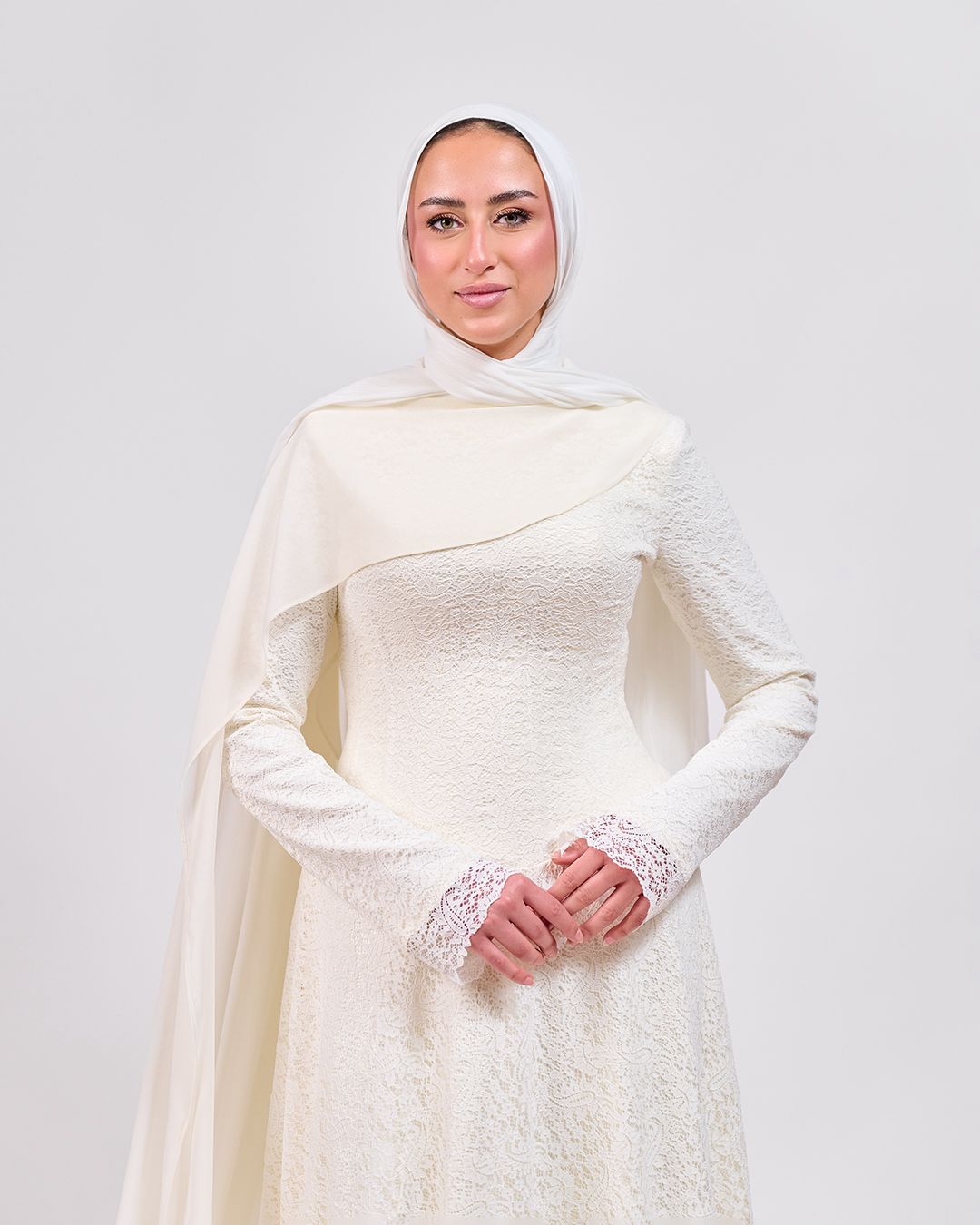 Crafted from delicate French lace, this dress features a structured internal corset for a flattering fit and is fully lined with satin for a smooth, luxurious feel. The removable shoulder extension adds versatility, draping elegantly or detaching for a more minimal look—perfect for special occasions and understated bridal moments.