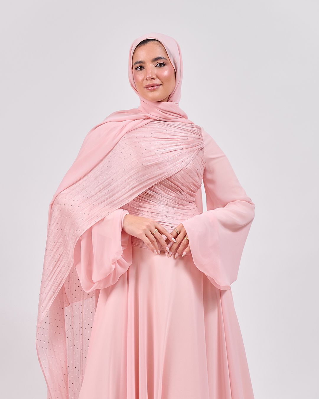 The Serene Drape Dress in Rose Blush – Shoulder Extension & Shimmer