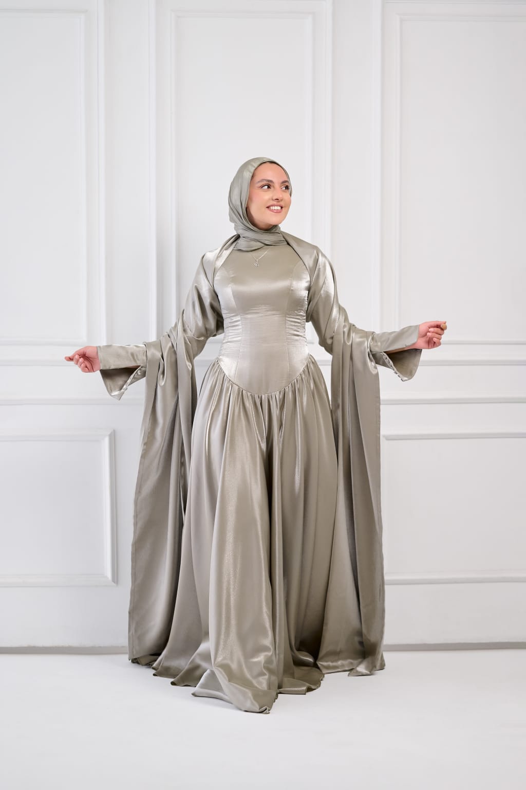 Italian Mikado satin dress featuring a built-in structured corset with satin lining, And a separate shawl made of Italian Mikado satin