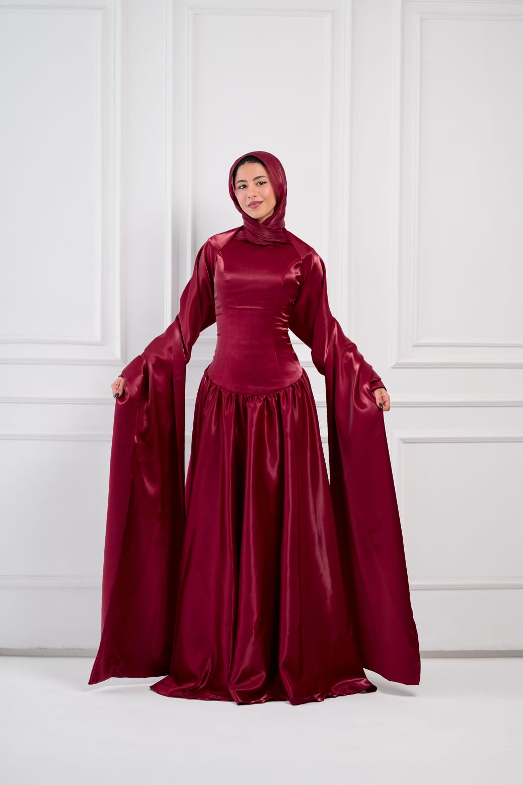 Italian Mikado satin dress featuring a built-in structured corset with satin lining, And a separate shawl made of Italian Mikado satin